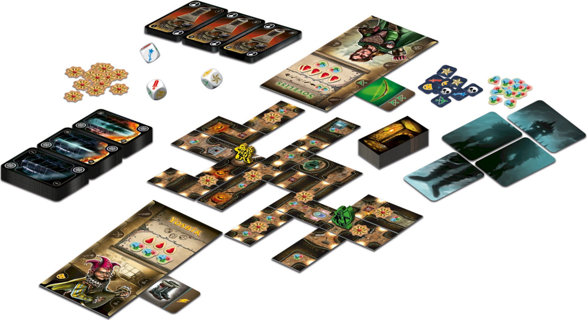 Contenu : 4 cartes de personnage, 4 pions, 6 dés, 48 tuiles de donjon, 24 plaquettes de malédiction, 16 points de vie, 16 plaquettes d'événement, 12 plaquettes de dé, 74 cartes d'événement, 30 cartes d'équipement, 4 cartes du Seigneur des Os, carte d'aide.