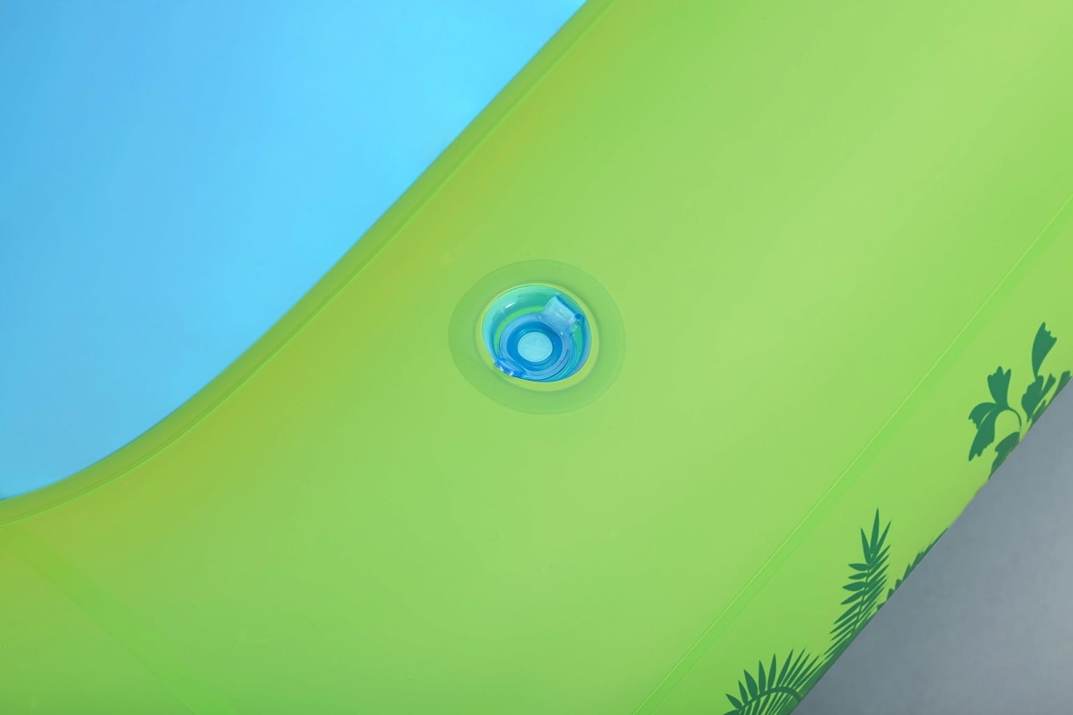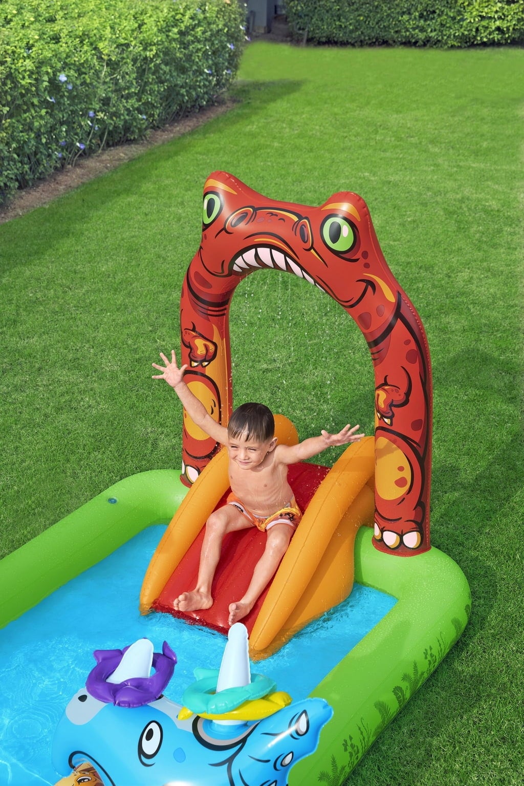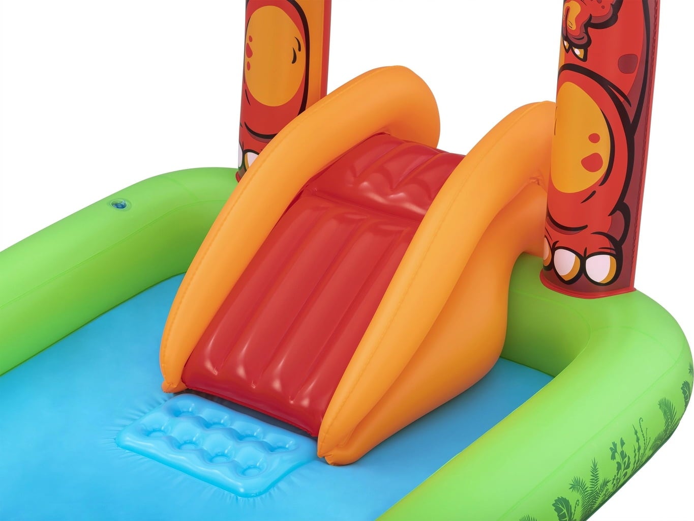 Uno scivolo con una morbida piattaforma di atterraggio garantisce scivolate divertenti, mentre il gioco del lancio dell'anello del triceratopo mette alla prova le tue abilità. Uno pteranodonte gonfiabile invita a lanciare una palla, mentre l'irrigatore d'acqua T-Rex garantisce un piacevole refrigerio: divertimento, avventura e refrigerio sono garantiti!