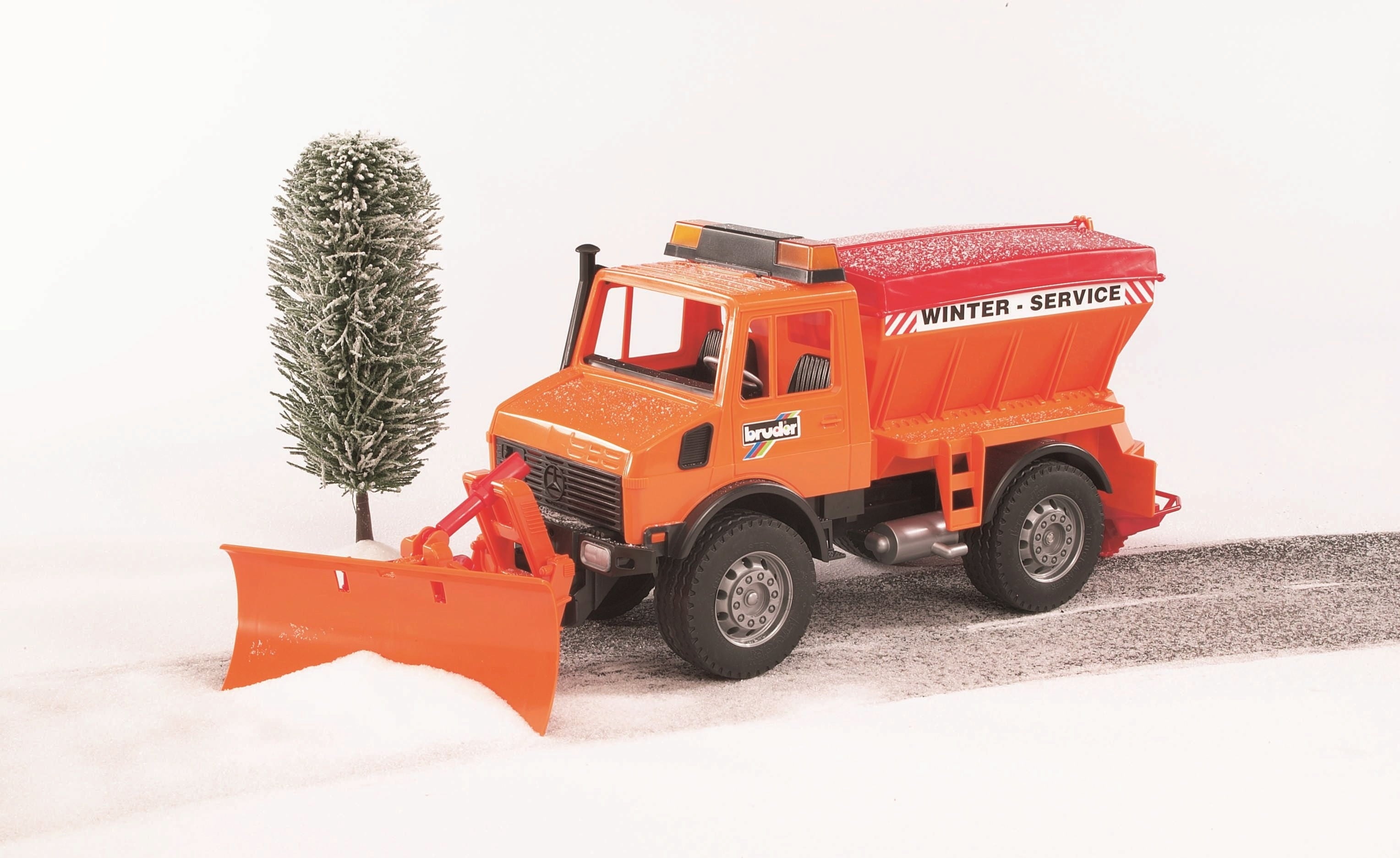 Il veicolo per il servizio invernale Unimog consente una simulazione realistica dello sgombero di strade innevate. La lama sgombraneve anteriore può essere spostata e bloccata in posizione. Il grande silo posteriore viene riempito tramite un coperchio. Il materiale sparso viene quindi distribuito dallo spargitore completamente funzionante.