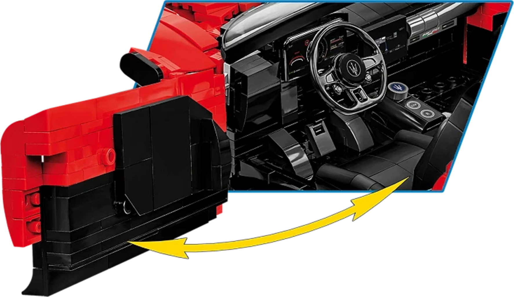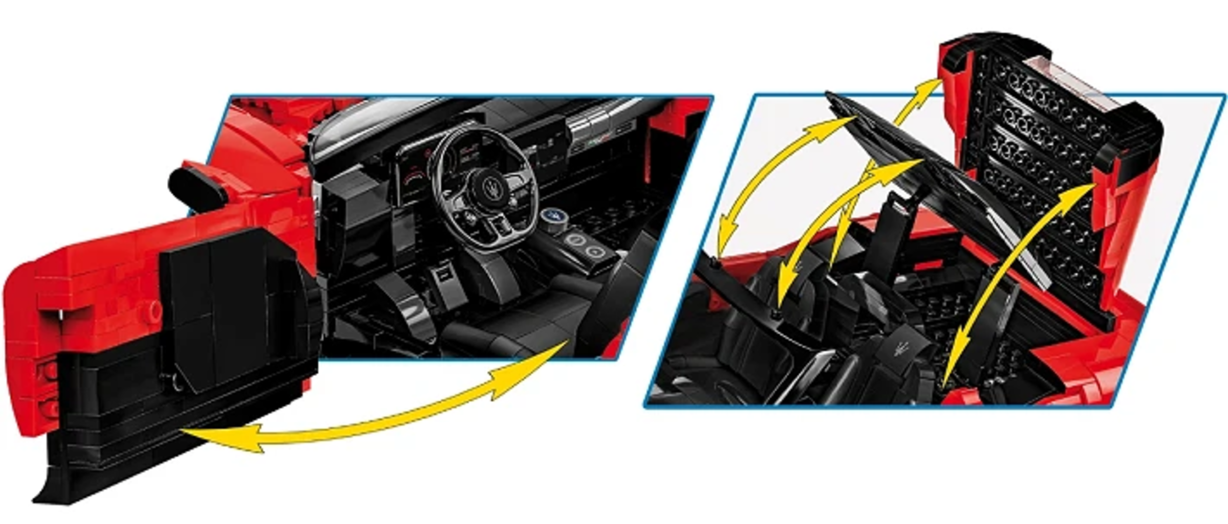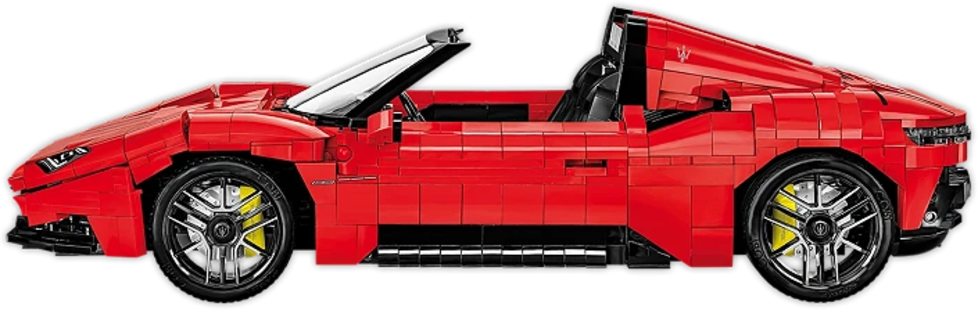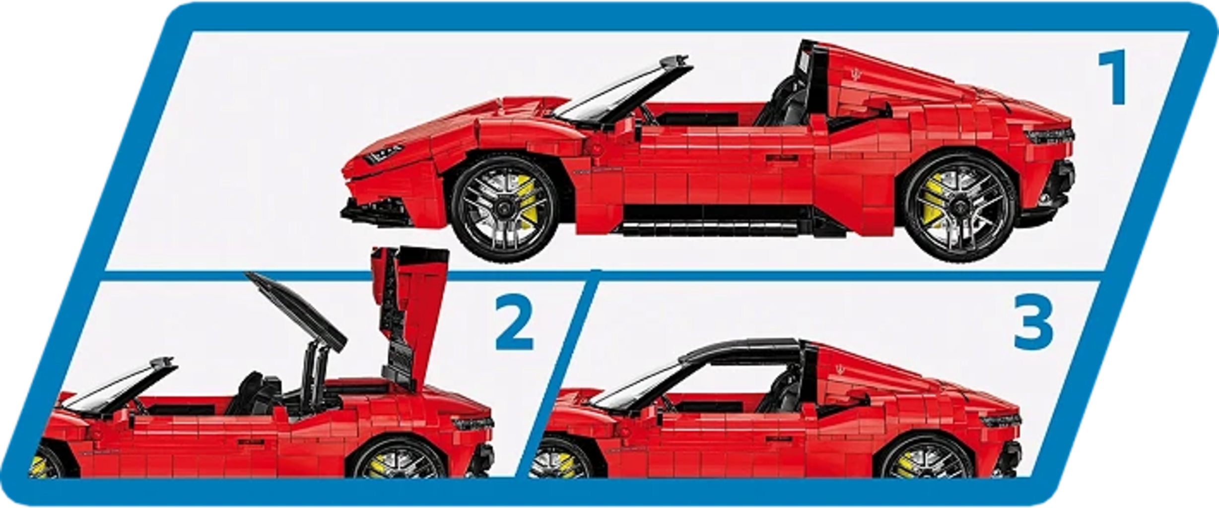 Oltre 2.100 mattoncini permettono di costruire la sorprendente Maserati MC20 Cielo in un grande modello di COBI ricco di dettagli. L'eleganza e il lusso italiano si riflettono nelle linee accurate e nelle soluzioni tecniche studiate con attenzione. Il tetto retrattile funzionante consente di trasformare la supercar in versione cabrio in pochi gesti.