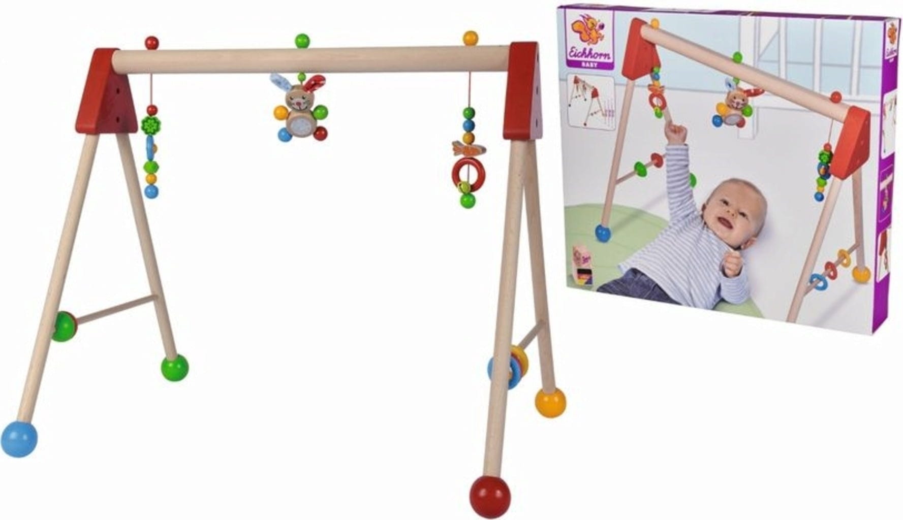 Questa palestrina intrattiene e conquista i piccoli esploratori. Raggiungere i giocattoli pendenti e multicolori, come la simpatica campanella e l'adorabile coniglietto con morbide orecchie, non è solo divertente, ma allena anche i muscoli. Sul lato ci sono anche vari elementi da ruotare e mordere.