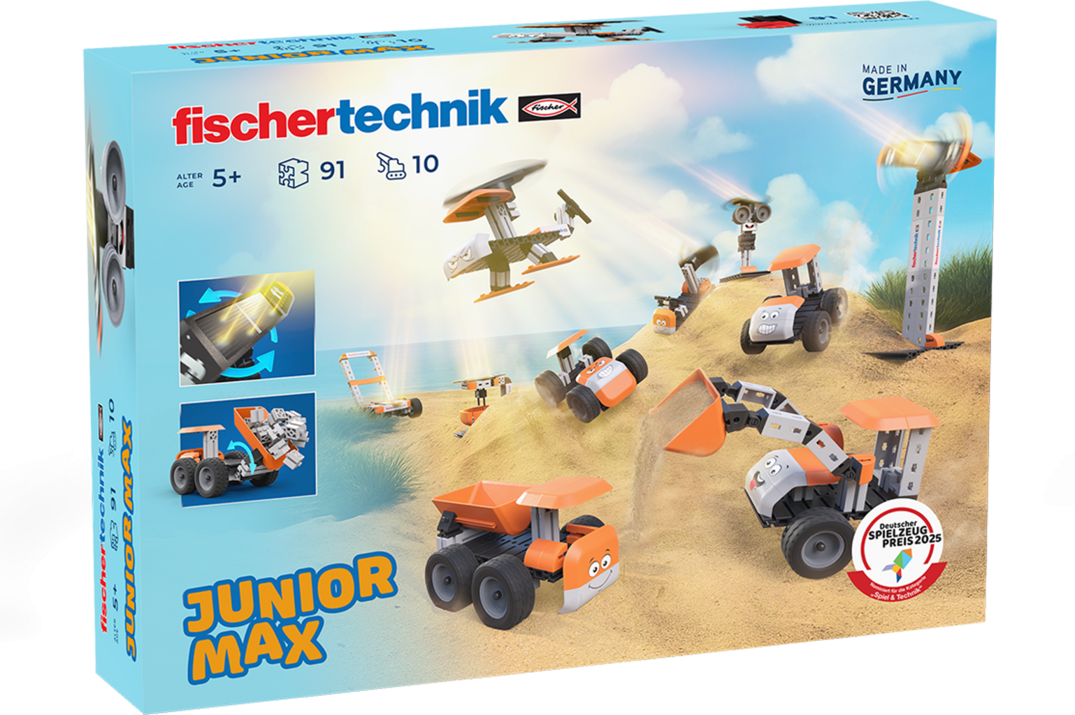 Con fischertechnik Junior Max i bambini a partire da 5 anni possono dare libero sfogo alla fantasia e allo stesso tempo comprendere la tecnica in modo intuitivo. Che si tratti di una turbina eolica, di un elicottero o di una figura a energia solare, ognuno dei dieci modelli mostra quanto possa essere creativo ed emozionante costruire. Il set stimola la motricità e il pensiero spaziale e rende tangibile l'uso delle energie rinnovabili nella vita quotidiana. Ideale per piccoli inventori che amano provare, scoprire e creare.