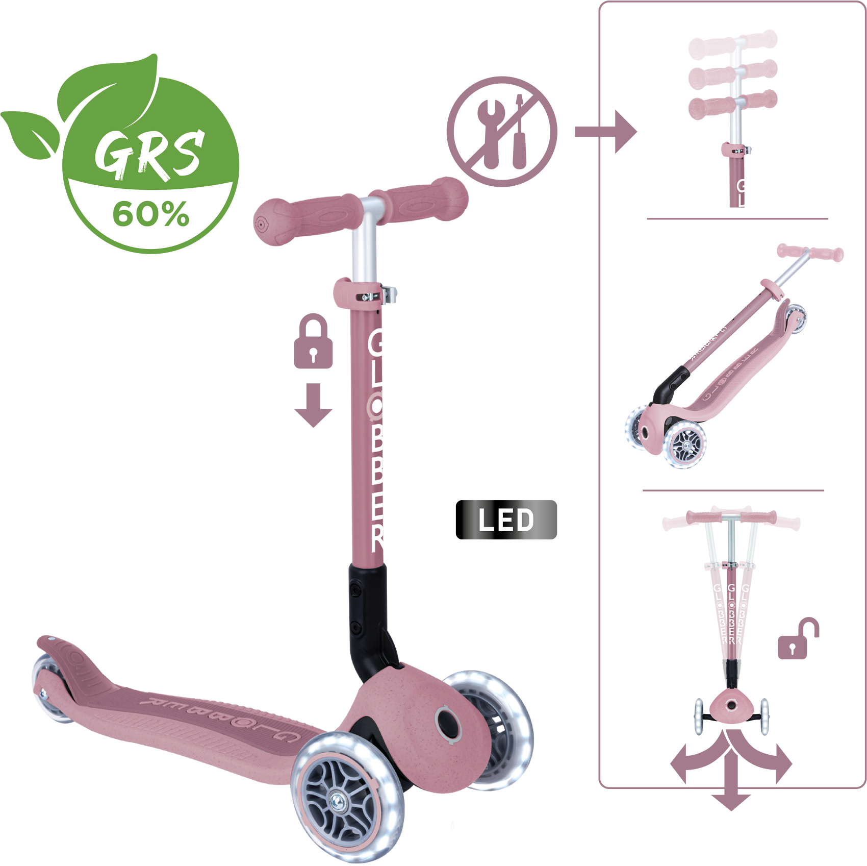Il modello Junior Foldable Lights Eco coniuga sicurezza e rispetto per l'ambiente. Realizzato con materiali riciclati, offre ai bambini dai 2 anni in su un mezzo stabile per esercitarsi nella mobilità, con tanto di divertimento grazie alle luci a LED sulle ruote.