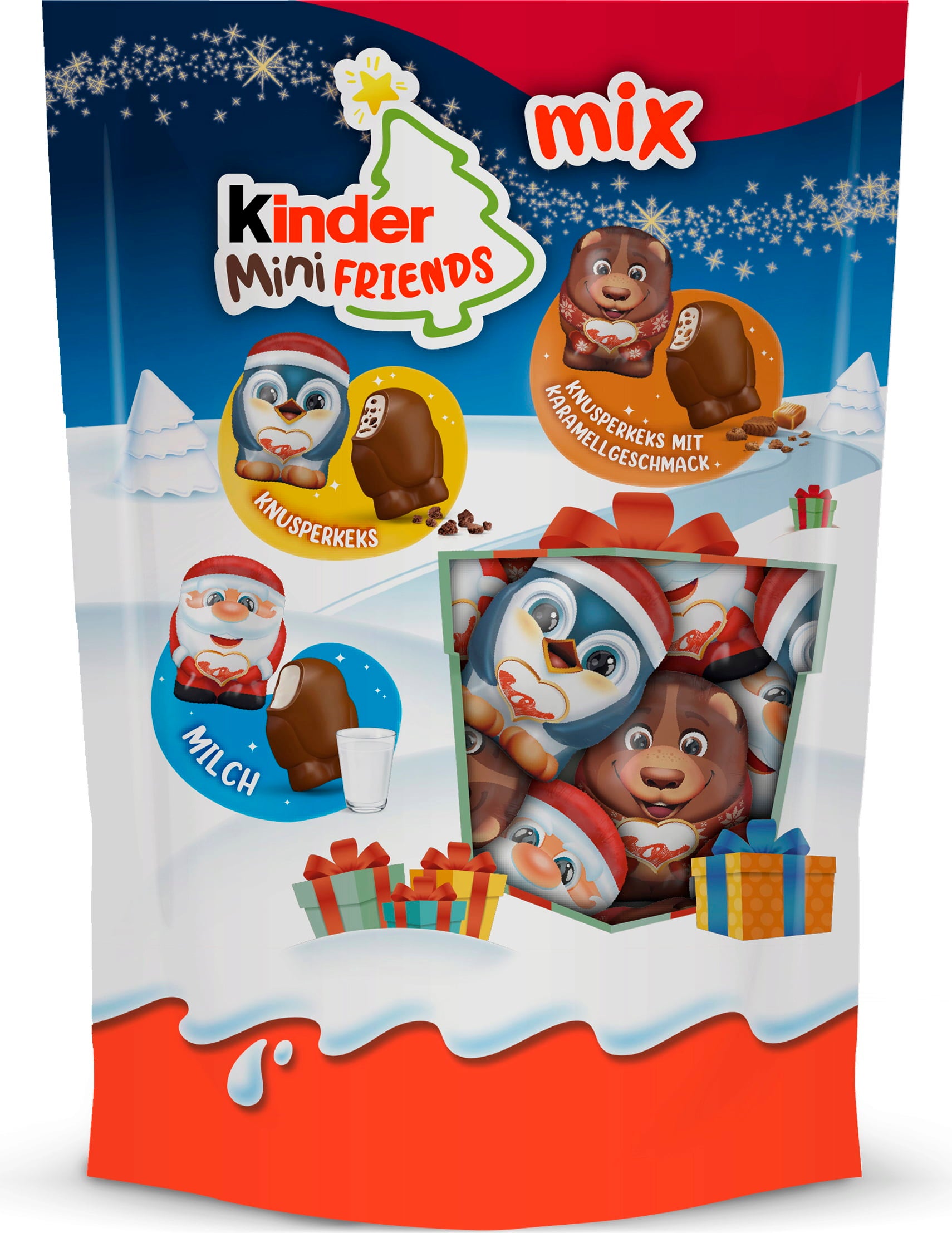 I Mini Friends di Kinder portano allegria sotto le feste con le loro forme simpatiche ispirate al Natale. Un guscio di cioccolato Kinder nasconde un ripieno diverso: crema al latte, biscotto croccante e biscotto al caramello. Una gioia per gli occhi e per il palato!