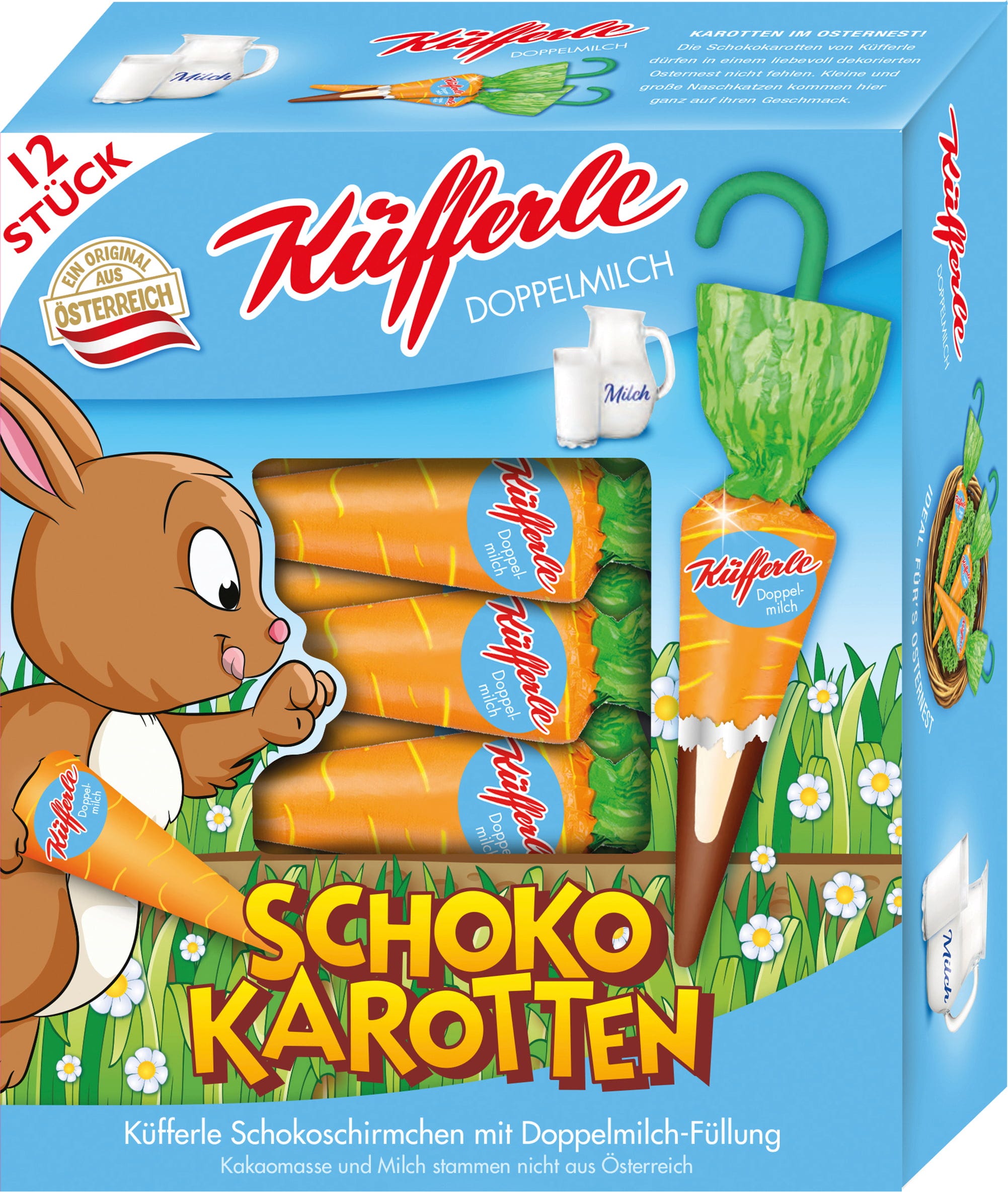 Se ami quel tocco in più, le carotine di cioccolato Küfferle sono la scelta ideale. Sotto il rivestimento di classico cioccolato al latte si nasconde un cuore di delicata crema al latte, che regala un’esperienza di gusto particolarmente morbida e avvolgente. Perfette come decorazione pasquale golosa o come piccolo regalo, aggiungono una nota dolce e originale alle feste di Pasqua.