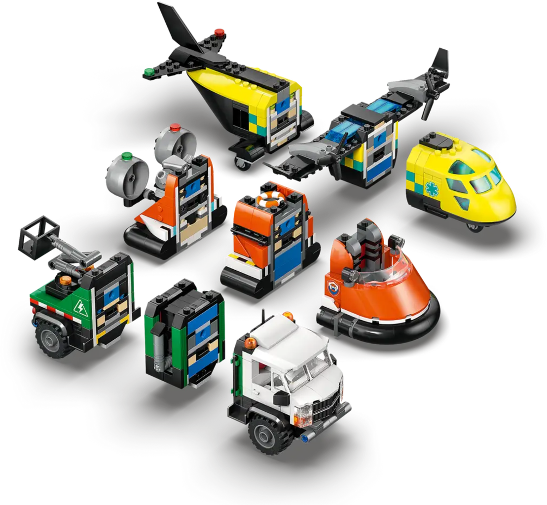 Il Set LEGO City Remix aereo, camion di servizio e hovercraft include 3 veicoli di emergenza dotati di parti modulari da combinare e ricreare. Il design "mix and match" stimola creatività e gioco di ruolo nelle missioni di soccorso, con minifigure e accessori inclusi.
