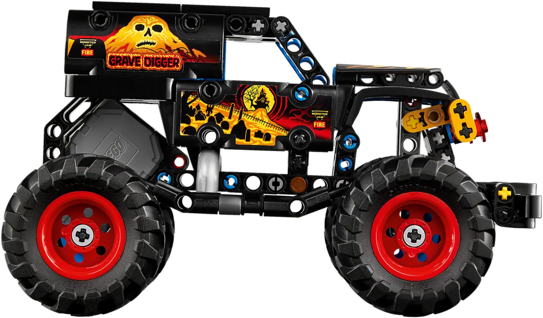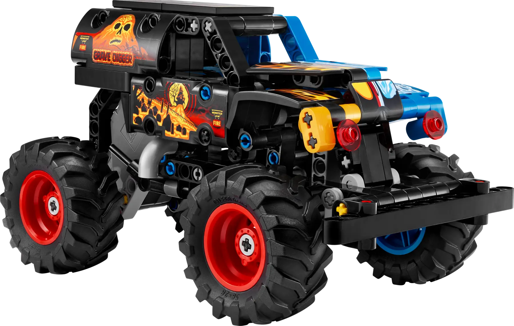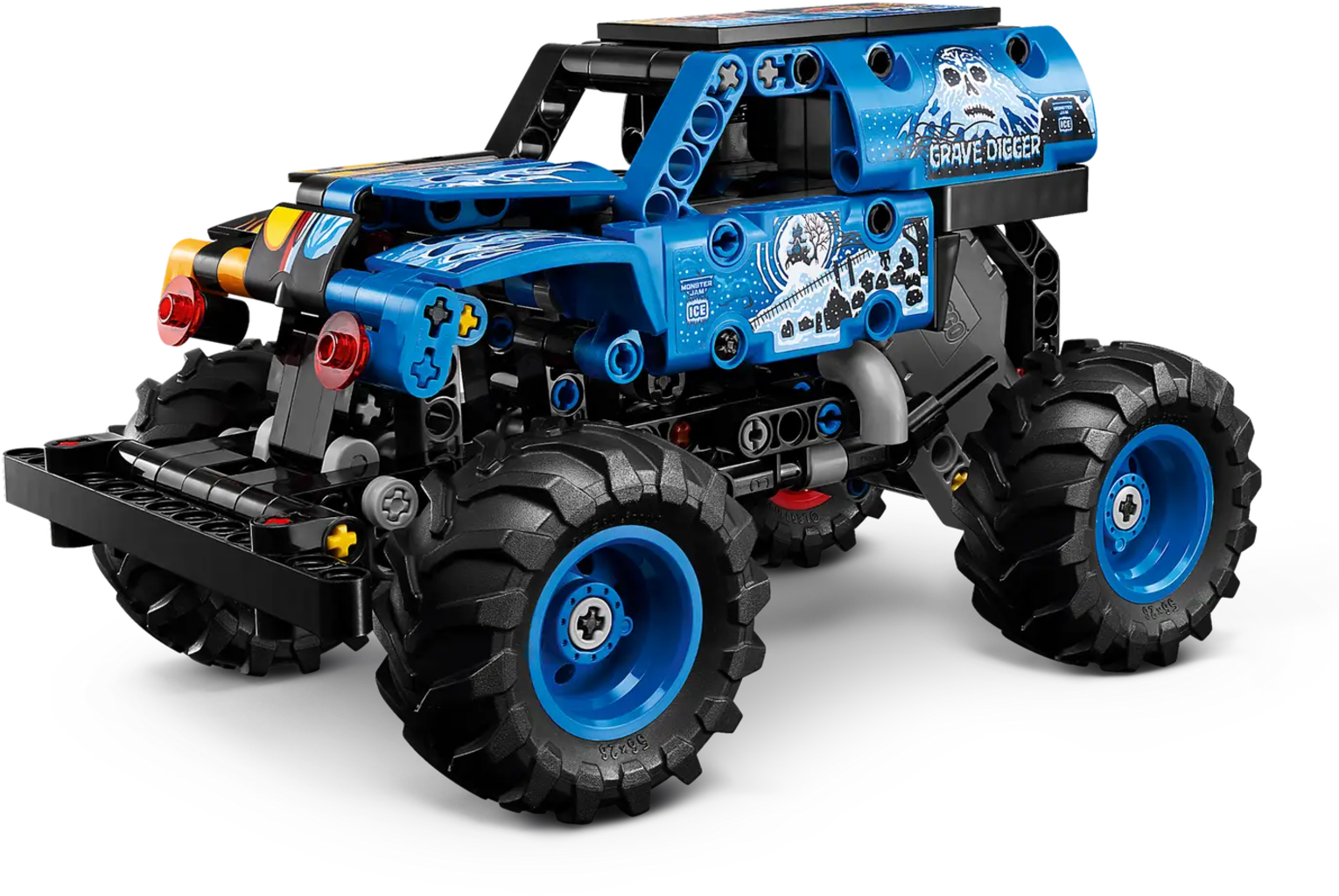 Monster truck LEGO Technic Monster Jam Grave Digger Fuoco e Ghiaccio con azione pull back, pensato per bambini dai 7 anni. Il modello riproduce fedelmente il celebre truck con dettagli fiamme e ghiaccio, stimolando il gioco creativo e le acrobazie ricche di movimento.