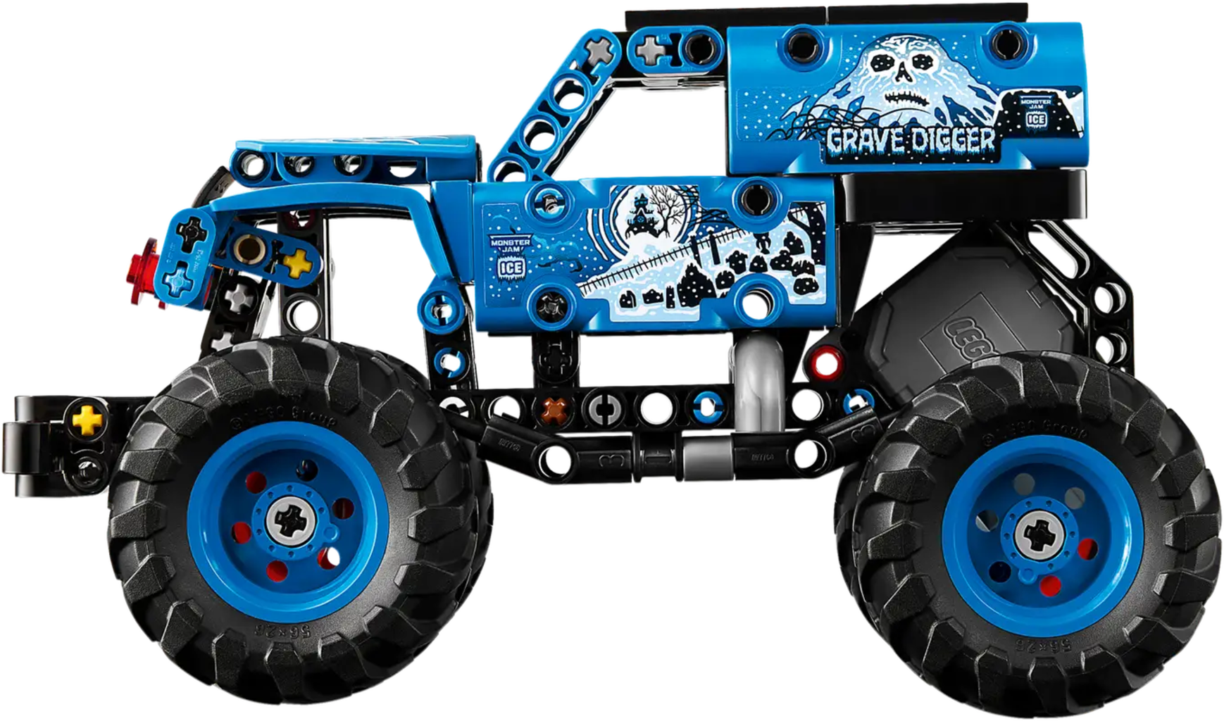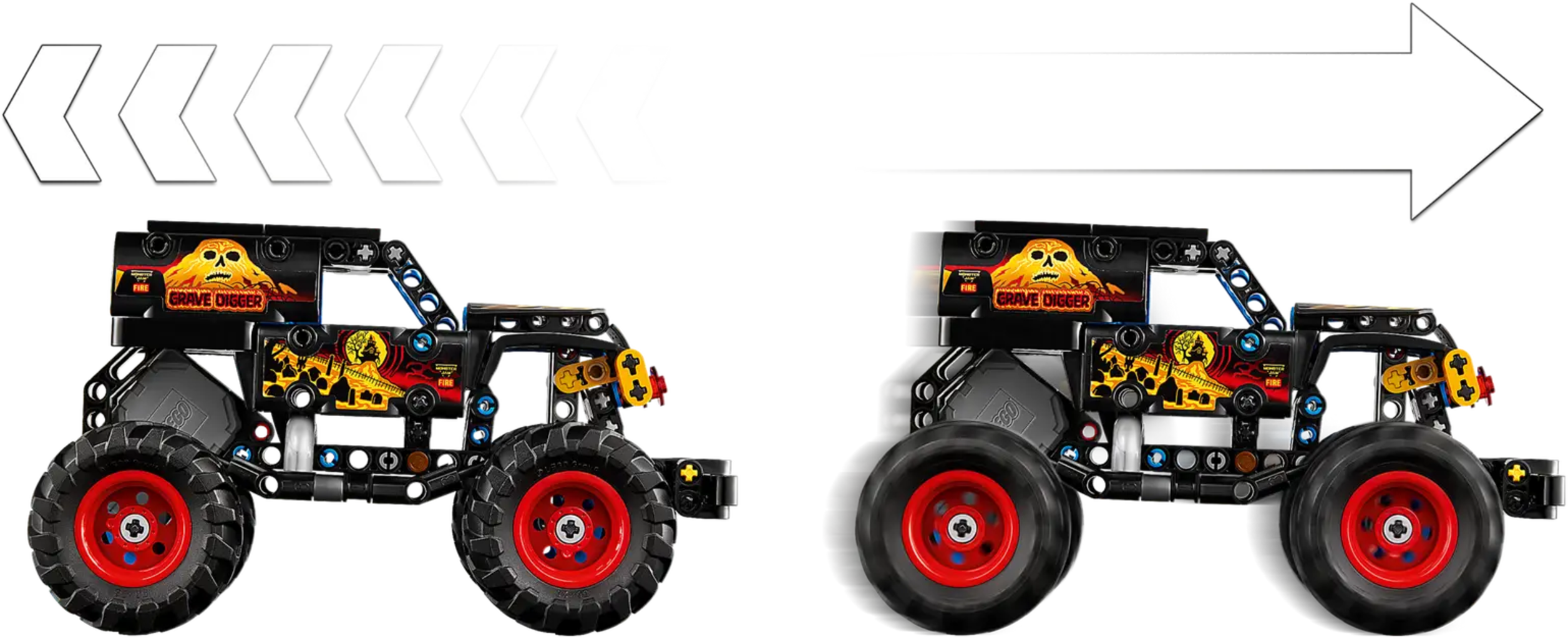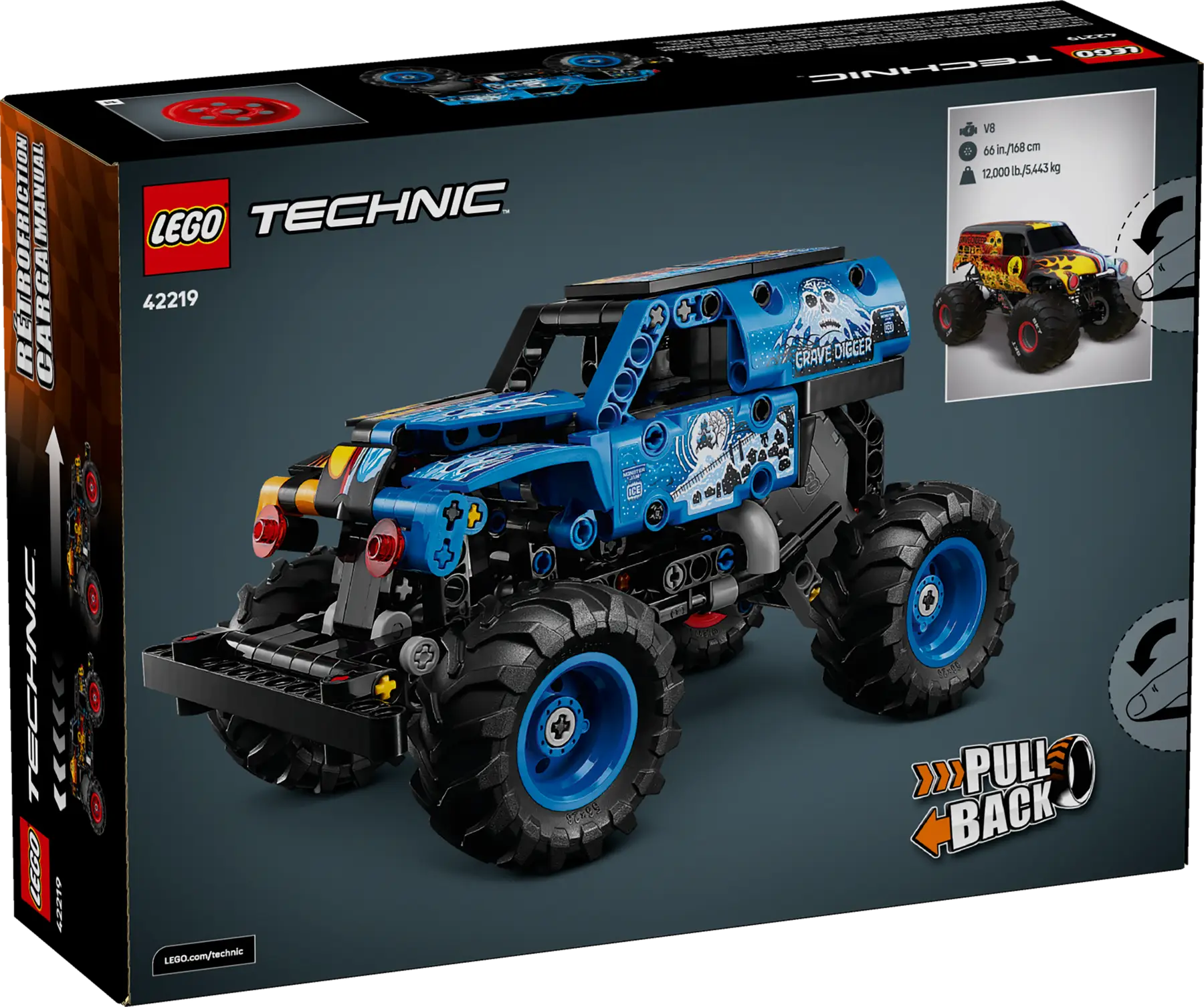 Monster truck LEGO Technic Monster Jam Grave Digger Fuoco e Ghiaccio con azione pull back, pensato per bambini dai 7 anni. Il modello riproduce fedelmente il celebre truck con dettagli fiamme e ghiaccio, stimolando il gioco creativo e le acrobazie ricche di movimento.
