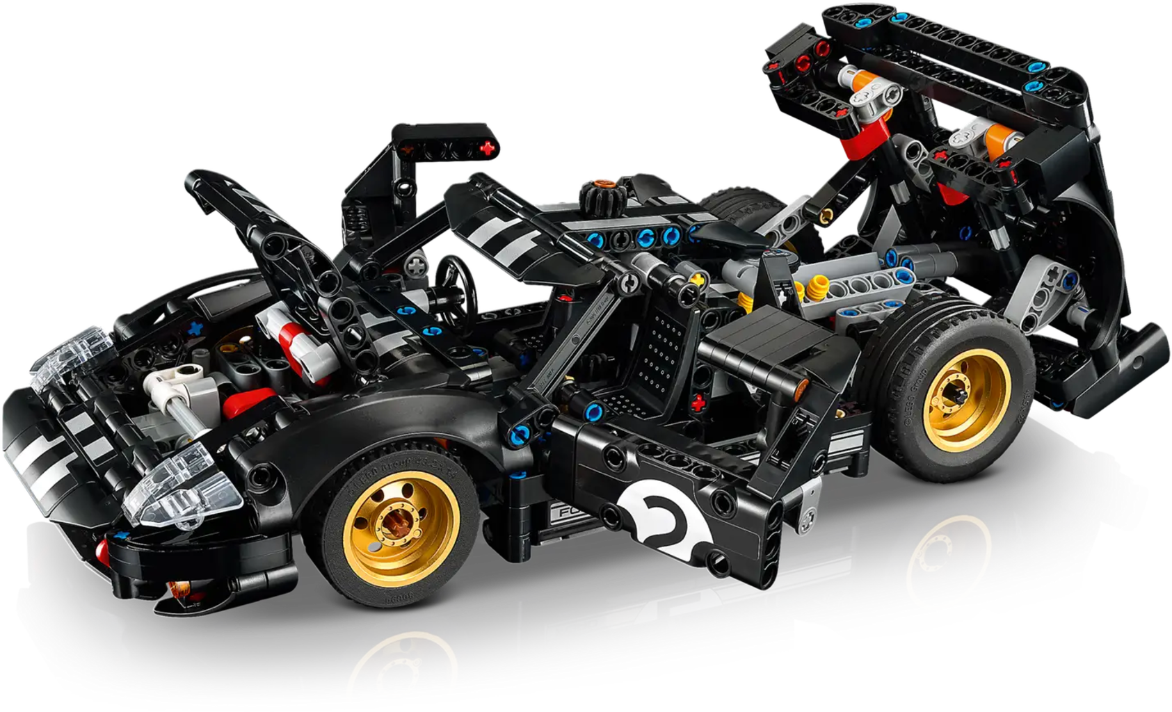 Il set LEGO® Technic Ford GT40 MKII 1966 riproduce fedelmente la leggendaria auto da corsa, con sterzo funzionante, sportelli apribili, cofano apribile e motore V8 visibile. La costruzione coinvolgente e il design iconico nero e argento rendono questo modello ideale da esporre, oltre che una raffinata idea regalo per adulti appassionati di auto e di costruzioni dettagliate.