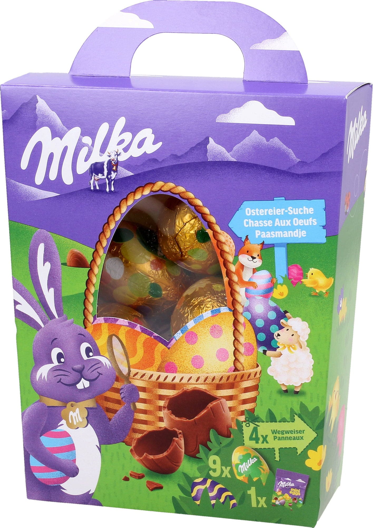9 uova di cioccolato al latte, ovviamente confezionate singolarmente, e una bustina piena di mini ovetti confettati. Un mix perfetto per organizzare un'avvincente caccia al tesoro con le uova e far divertire i piccoli di casa. Sul retro della confezione in cartone si possono ritagliare dei cartoncini per scrivere gli indizi per la caccia alle uova. Pronti a giocare?