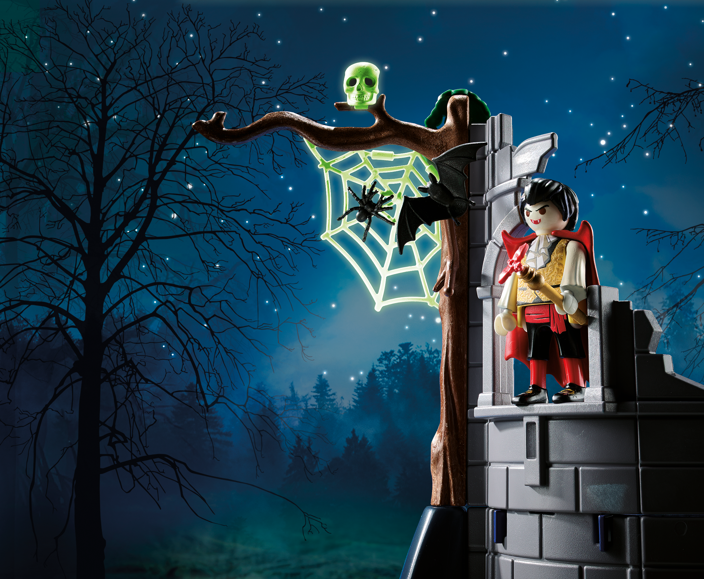 - Accessori: 1 cappello a tricorno, 1 grembiule, 1 mantello, 1 pergamena, 1 bastone con attacco a pipistrello, 8 pezzi di muro, 2 finestre con ragnatele, 1 scala, 1 albero, 3 piante sospese, 1 ragnatela, 1 teschio, 1 candela, 1 torcia, 1 trono, 1 forziere del tesoro, 2 ossa, 1 catena con grillo, 1 tagliere, 1 pezzo di formaggio, 1 tavolo, 1 sgabello, 2 bicchieri da laboratorio, 1 bicchiere da distillazione con supporto, 1 lampada a olio, 1 penna d'oca con supporto, 1 libro, 1 coltello, 3 cristalli, 1 personaggio cripta", 1 scudo, 2 corna