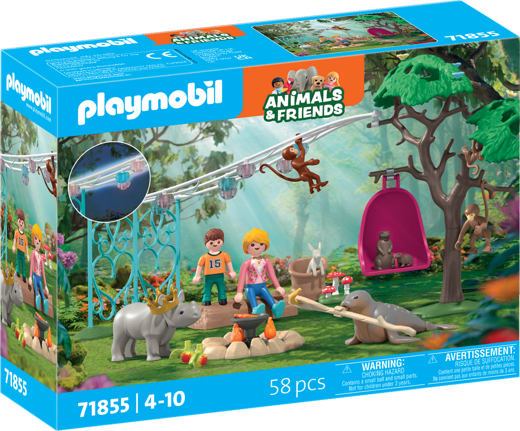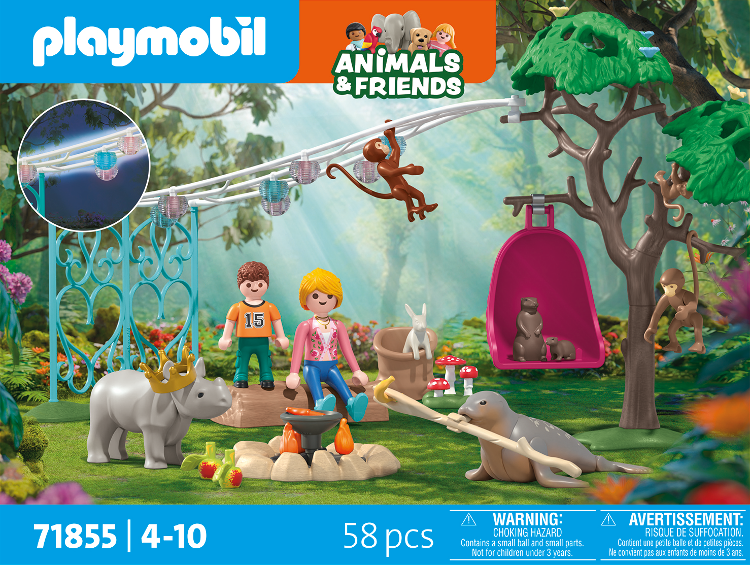 Contenuto: 1 donna, 1 ragazzo, 1 foca, 1 coniglio, 1 cucciolo di rinoceronte, 1 castoro, 1 cucciolo di lontra, 2 scimmie, 1 cucciolo di scimmia, 4 uccelli, 1 albero con piastra di base e sedia appesa, 1 piastra di base con elemento di recinzione, 1 ghirlanda con lanterne, 1 piastra di base con funghi, 1 falò con ciotola per barbecue e frutta, 1 ramo, 1 tronco d'albero sdraiato, 1 sacco di iuta, 1 corona di compleanno.