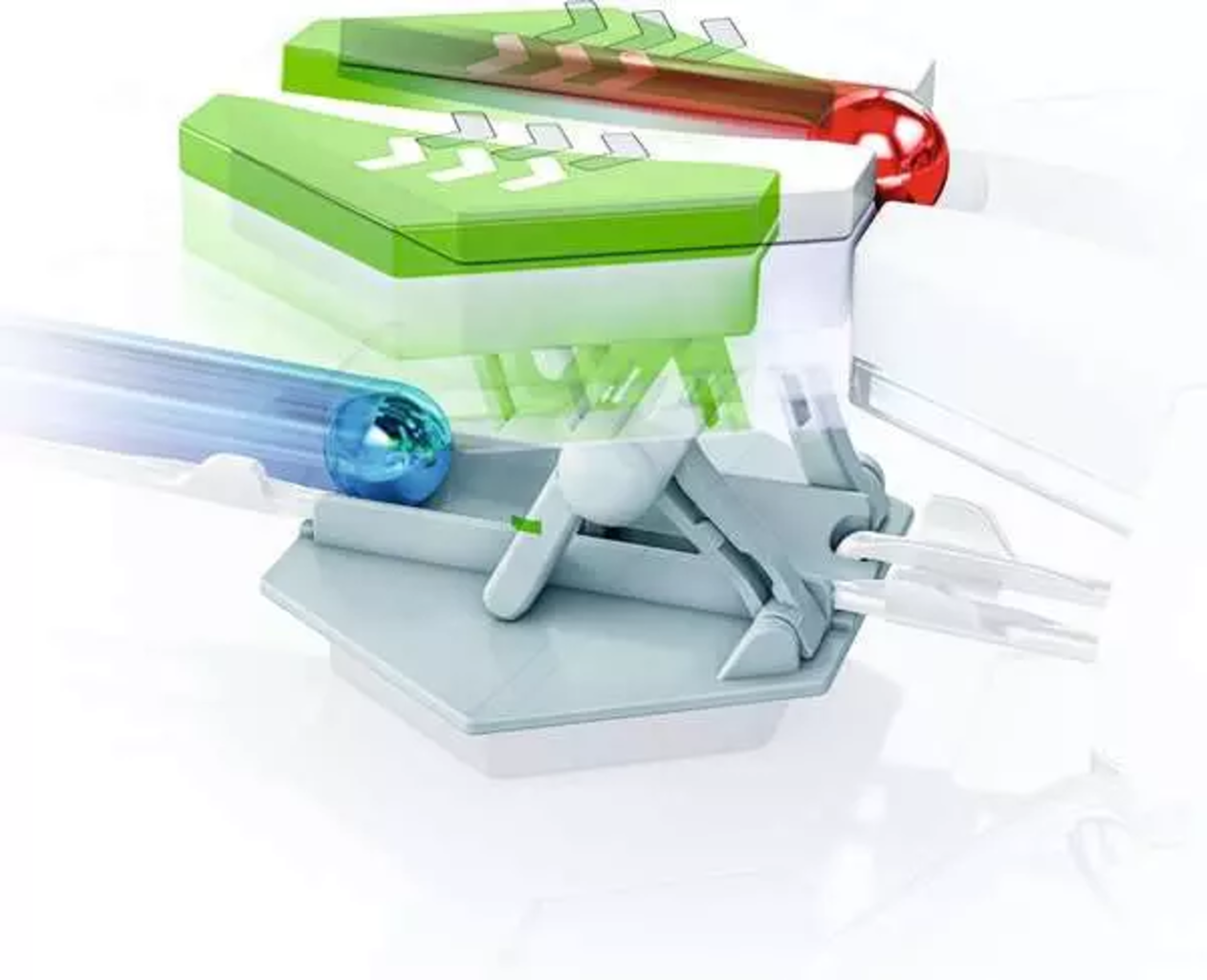 Il Jumper offre un effetto sorprendente. Quando una biglia entra nell'elemento, viene sollevata su un livello superiore per continuare il suo percorso. Allo stesso tempo, il Jumper libera il passaggio sottostante, fungendo da tunnel per le biglie successive. In questo modo i bambini imparano a pianificare flussi complessi e a utilizzare l'energia della pista in modo efficiente.